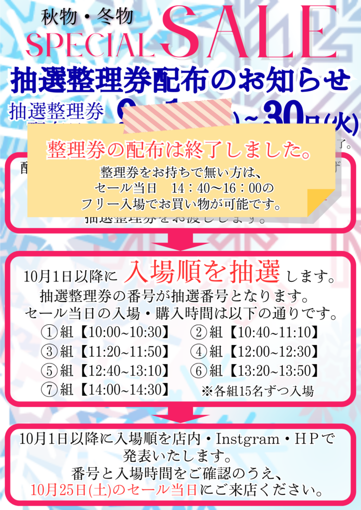 10月25日(土)開催予定のSpecial SALEの抽選整理券は、