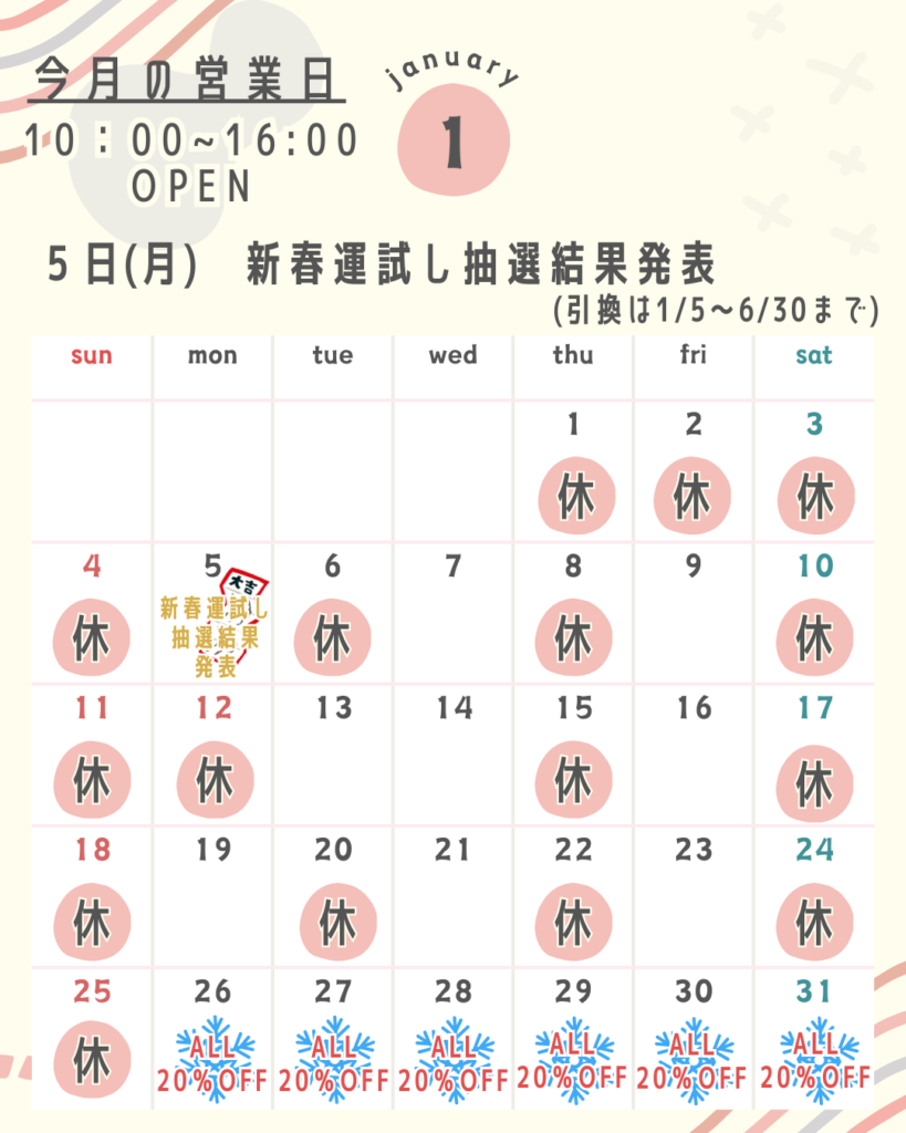 月末20%OFFの週は月曜日~金曜日(土曜日)の営業になります📅