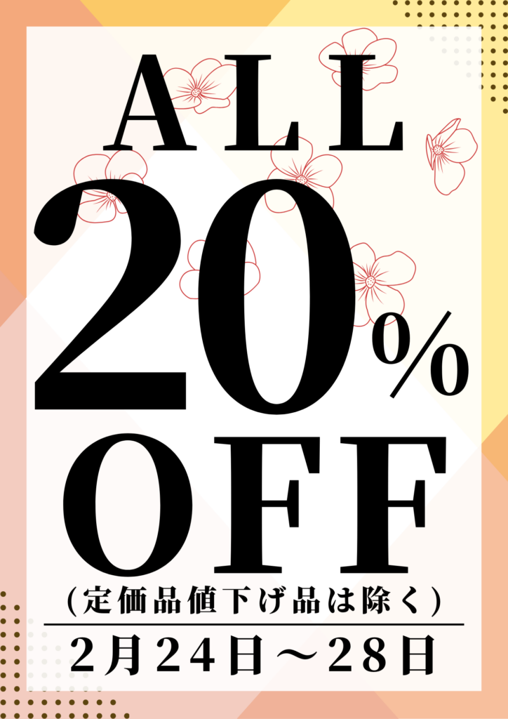 本日24日から28日まで月末恒例20%OFF SALEとなります👏 冬物商品の販売も残りわずかとなっております☃️一部、春物商品も販売しておりますので、お得な機会にぜひご来店ください👍 お買い物前にお客様にお知らせ。